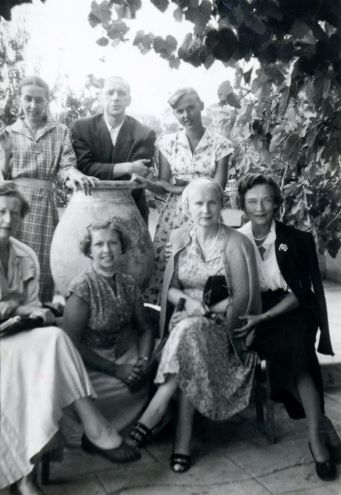 Antano Liutkaus viloje „Villa America“. Stovi (iš kairės): tarpukario diplomato ir dailininko Antano Liutkaus žmona Janina MikulskytėLiutkienė, lietuvių kilmės prancūzų semiotikas, kalbininkas, mitologas, eseistas Algirdas Julius Greimas. Sėdi (iš kairės): pulkininko Juozo Lanskoronskio žmona Madlen (Madeleine) de GroefLanskoronskienė, Algirdo Juliaus Greimo žmona Ona Bagdonaitė-Greimienė, diplomato Petro Klimo žmona Bronė Mėginaitė-Klimienė, tarpukario Lietuvos ministro primininko Juozo Tūbelio našlė Jadvyga ChodakauskaitėTūbelienė. Villefranche, Prancūzija, 1960 m.